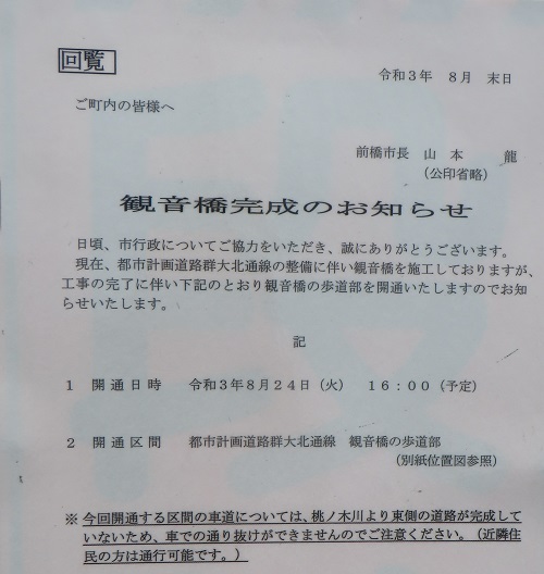 観音橋は8月24日開通予定 投稿 2021/08/23更新 2021/08/23 前橋市 この記事の最終更新日は 2021年8月22日 です。現在は状況が異なる場合がありますので予めご了承ください 下小出中央公園からほど近い場所 桃ノ木川に架かる観音橋ですが 新しい橋への架け替え工事は 終わったようです。 といっても、まだ通れなくて 開通日時は8月24日の16時予定だそうです。 橋は開通しても、その先東側の道路は まだ工事中なので、利用するのは近隣住民の方 くらいでしょうか。 最終的には、 県道津久田停車場前橋線につながるらしい。 カテゴリー前橋市 タグ観音橋 のりを