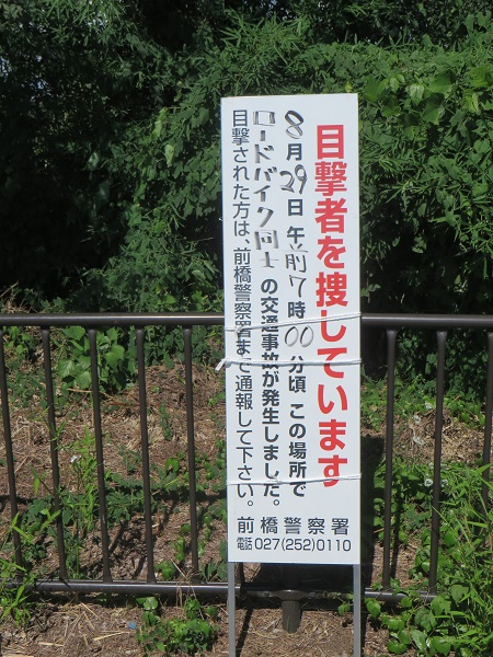 サイクリングロードでロードバイク同士の事故2021/09/11自転車平成大橋のところから利根川サイクリングロード入って玉村方面に向かっています。久しぶりのサイクリングなのでゆっくりペースで。すると、育英高校の先にこのようなものが ...記事を読む
