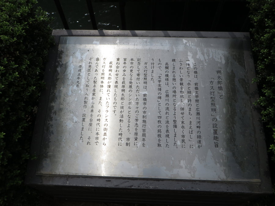 朔太郎橋とガス灯型照明 投稿 2015/05/22更新 2015/05/22 前橋市 前橋文学館前の 広瀬川に架かる朔太郎橋。 この橋の欄干には ガス灯型照明が設置されています。 今までは通りがかっても 別に気にもならなず素通りしていたのですが 先日通りがかった時は 妙に気になって良く見ていたら その近くに、設置趣旨がありました。 (クリックすると大きくなります) なるほど、 そいういう事だったんですね(^^ゞ カテゴリー前橋市 タグガス灯型照明 / 朔太郎橋 のりを